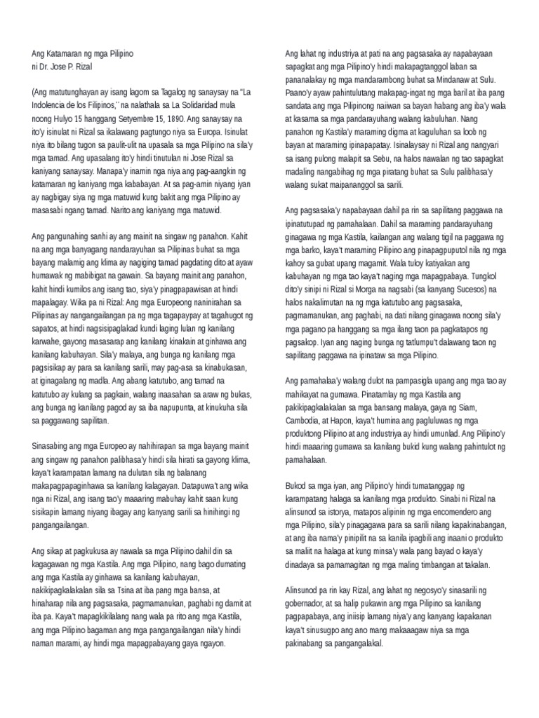 Ang Katamaran ng mga Pilipino ni Dr. Isa sa mga kilalang sanaysay ay ang mga isinulat ni Jose Rizal. Sobre la indolencia de los filipinos Posted by Mark Josell Dejasco November 6 2019 November 6 2019 Posted in Uncategorized Ang Pilipinas sa kasalukuyan ay nanatiling isang Third World Country sa kabila ng mahabang panahon na pagsubok upang umunlad.