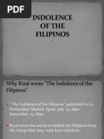 La Indolencia de los Filipinos more popularly known in its English version The Indolence of the Filipinos is a exploratory essay written by Philippine national hero Dr. It was written by José Rizal as a response to the accusation of Indio or Malay indolence. Jose Rizal to explain the alleged idleness of his people during the Spanish colonization.