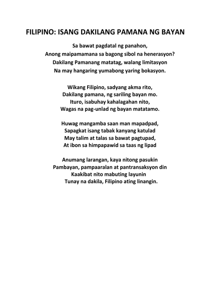 Wikang Filipino ito ay ang ating pamabansang wika ng PilipinasAng pag g amit ng wikang ito ay nakaktulong sa mga pilipino upang magkaintindihan ang mga tao at para mapag isa tayong mga pilipino. Maitaguyod ang ating mga hangarin at maisulong ang ating mga adhikain. Ang naumpisahan na nating reporma sa bagong K-12 Curriculum na nagnanais na tumugon sa hamon na mahasa ang ating kabataan na gamitin at palawigin ang wikang ating kinagisnan pati narin ang ating.