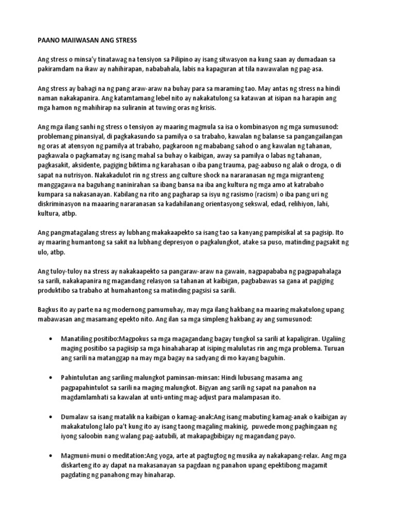 Magkaroon ng kamalayan na ang stress ay nagsisimula sa aming mga pananaw. Jan Kyle Leaño Ang stress ay nakukuha o nararamdaman sa ibat-ibang sitwasyon. Nainis ako sa pag-aaral.