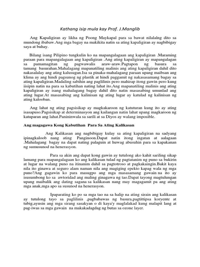 Narito ang ilang mungkahing pamamaraan para mapangalagaan ang kapaligiran. Dito rin nanggagaling ang ating kaalaman na dahil sa kuryosidad sa napakahiwagang nilikha ng Diyos nasusubok natin ang hangganan ng ating kaalamanAno-ano ba ang mga bagay na kaya nating gawin bilang kabataan upang mapanatiling malusog ang ating kalikasan. Ang Kapaligiran ay likha ng Poong Maykapal para sa bawat nilalalng dito sa mundong ibabawAng mga bagay na makikita natin sa ating kapaligiran ay nagbibigay saya at buhay.
