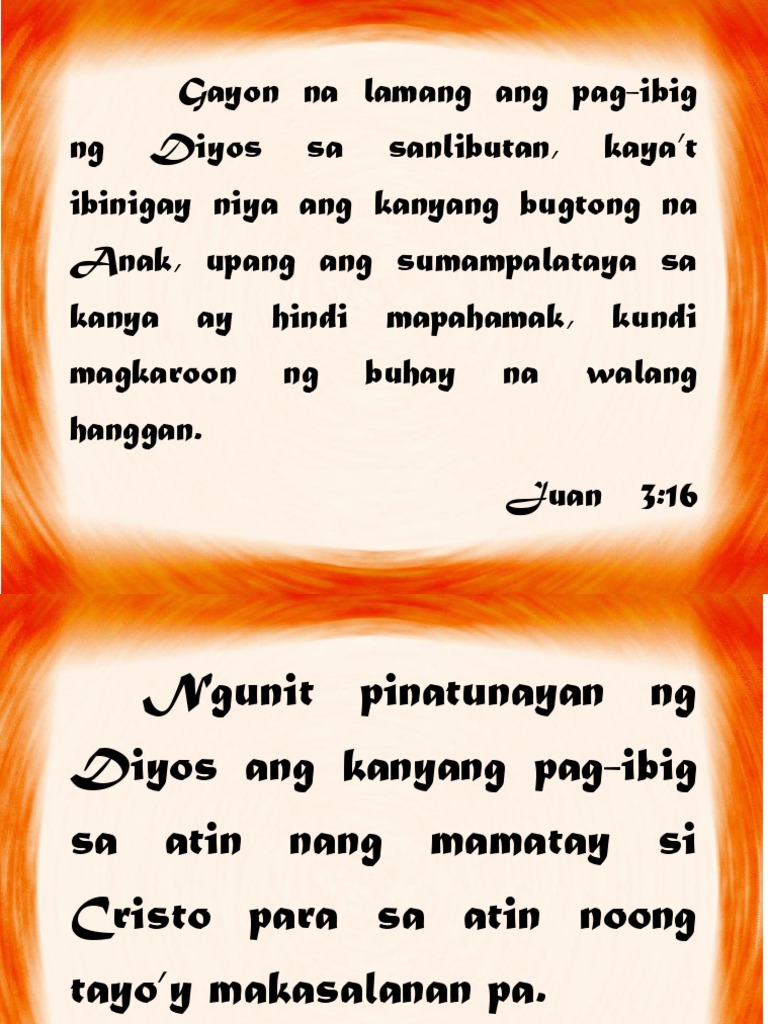 16 Dahil mahal na-mahal ng Diyos ang sanlibutan kaya ang anak nyang kaisa-isay kanyang ipinagkaloob at-nang sinuman ang maniwala sa kanyay di mapapahamak kundi. Ang anak ng tao upang ang sinumang sumampalataya ay magkaroon sa kaniya ng buhay na walang hanggan.