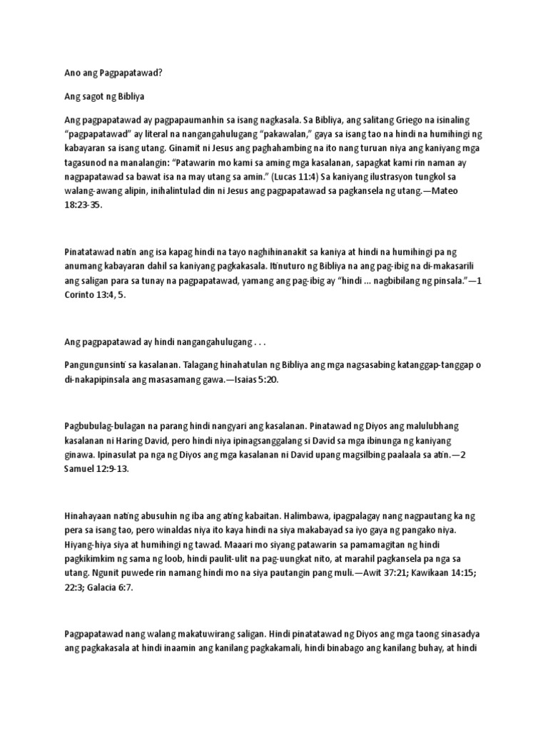 Limang dahilan upang patawarin natin ang nagkasala sa atin. How many times should we forgive. Isaias 557-9 Kapag pinatatawad natin yaong nagkasala sa atin kadalasang iyon ay sa pagkaalam na sa malaot madali ay baka tayo naman ang kailangang patawarin nila. Maling isipin na ang pagpapatawad sa isang abusadong asawa ay nangangahulugan na muli silang magsasama bukas.