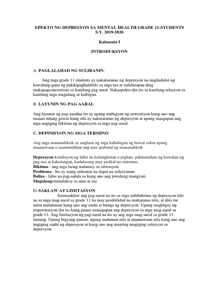 Ang pag-aaral na ito ay ukol lamang sa mga pagpapatunay na ang depresyon ay isa sa mga dahilan ng kawalan ng gana ng mga estudyante sa pag-aaral sa mga sintomas ng pagkakaroon ng depresyon at sa mga bagay na maaring gawin upang maiwasan o. Ano ang mga maaaring gawing kilos upang maiwasan ang depresyon. Paano naipakikita ng tao ang kabutihang natatanggap sa iba.