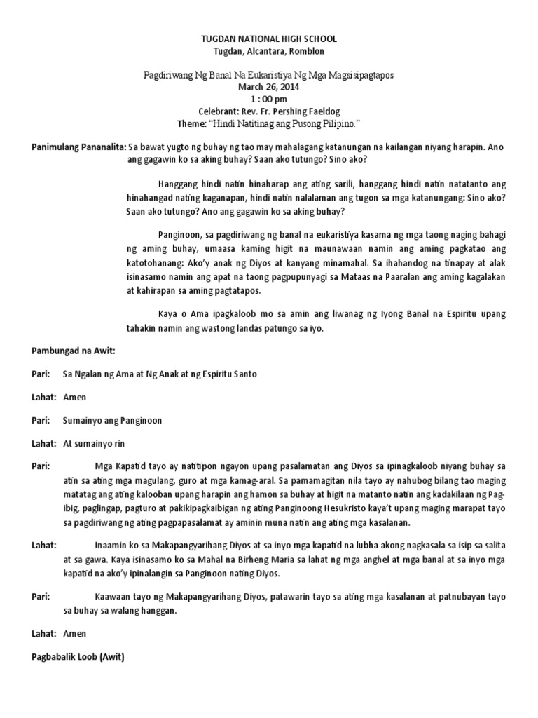 At kikilalanin ng lahat na si Jesu-Cristo ang Panginoon sa ikapupuri ng Dios Ama. Noon hindi kayo kinaawaan ng Dios pero ngayon kinaawaan na niya kayo. Kaya naman itinaas siyang lubos ng Dios at binigyan ng titulong higit sa lahat ng titulo upang ang lahat ng nasa langit at lupa at nasa ilalim ng lupa ay luluhod sa pagsamba sa kanya.