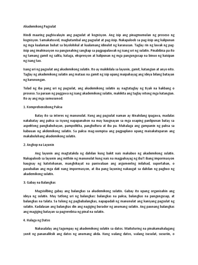 Kahulugan Kalikasan at Katangian. Alamin Isa sa makrong kasanayan sa pakikipagtalastasan ang pagsulat at ang wika ang pangunahing sangkap sa pagbuo ng isang sulatin na magluluwal ng ibat-ibang ideya na magiging mensahe sa anumang isusulat. Upang maging komprehensibo at epektibo ang pagbuo ng mga ito marapat na alamin at unawain ang anyo ng akademikong sulatin.